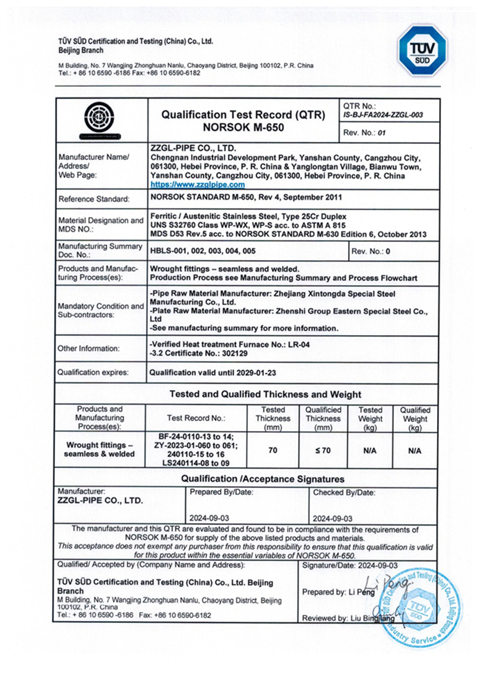 公司已通過NORSOK M-650 ASTM A815 UNS S32760挪威國家石油標準認證。