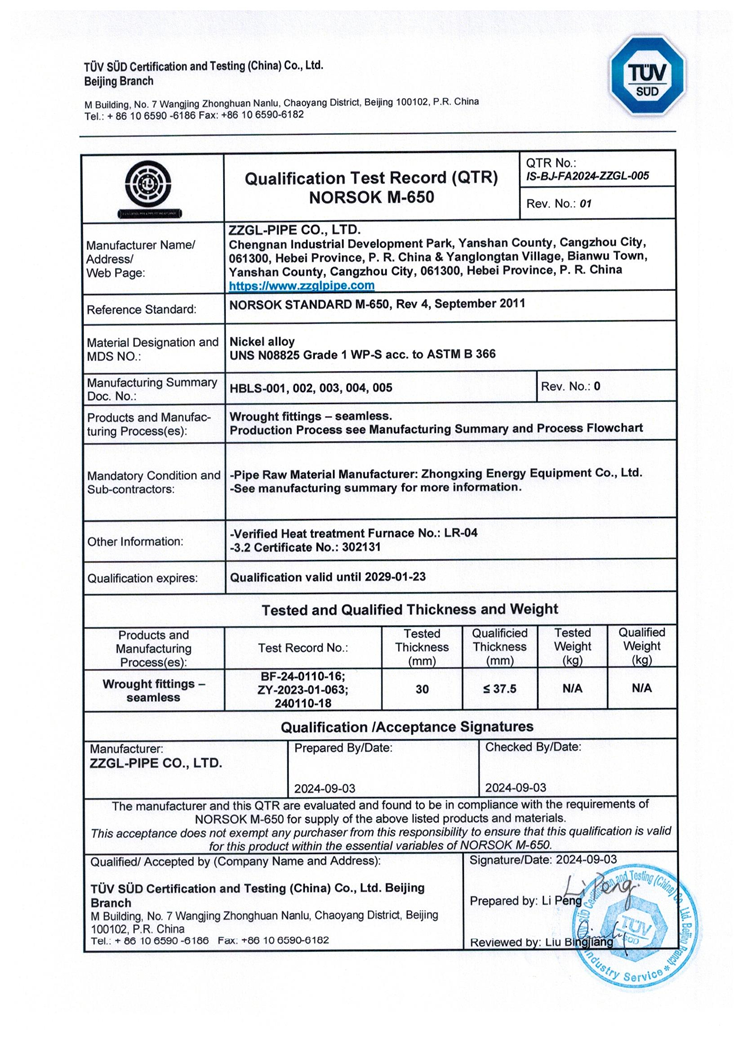 公司已通過NORSOK M-650 ASTM B366 UNS N08825挪威國家石油標準認證。