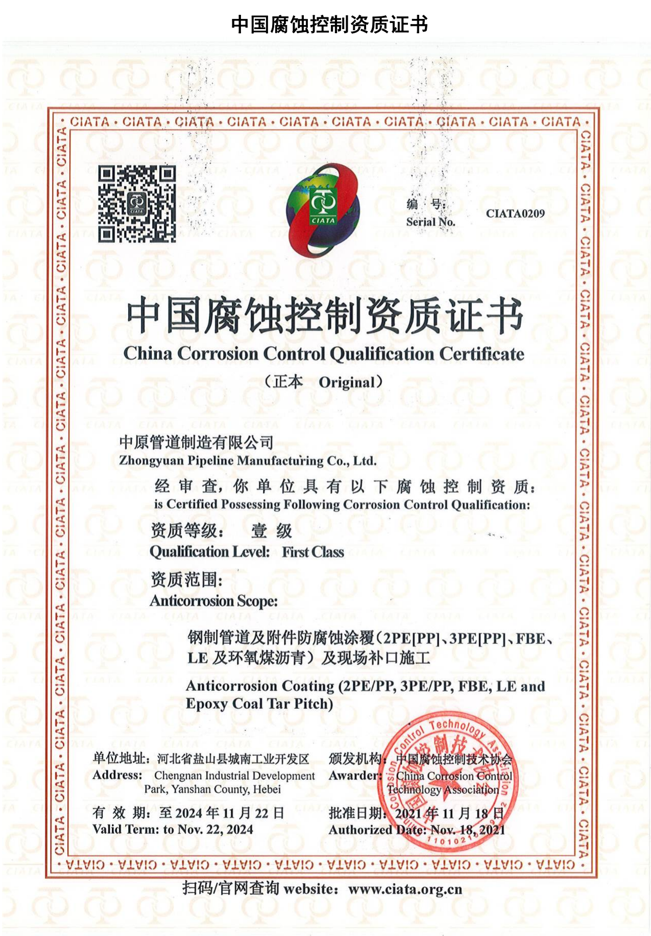 3PE/PP鋼製管道及附件防腐蝕塗資質證書