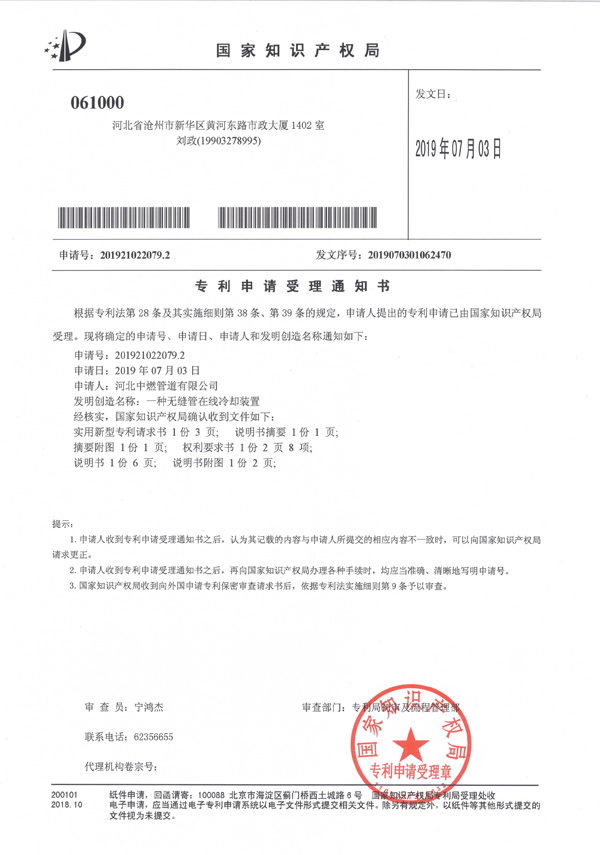 “一種螺旋鋼管的內部清理裝置”專利申請受理通知書