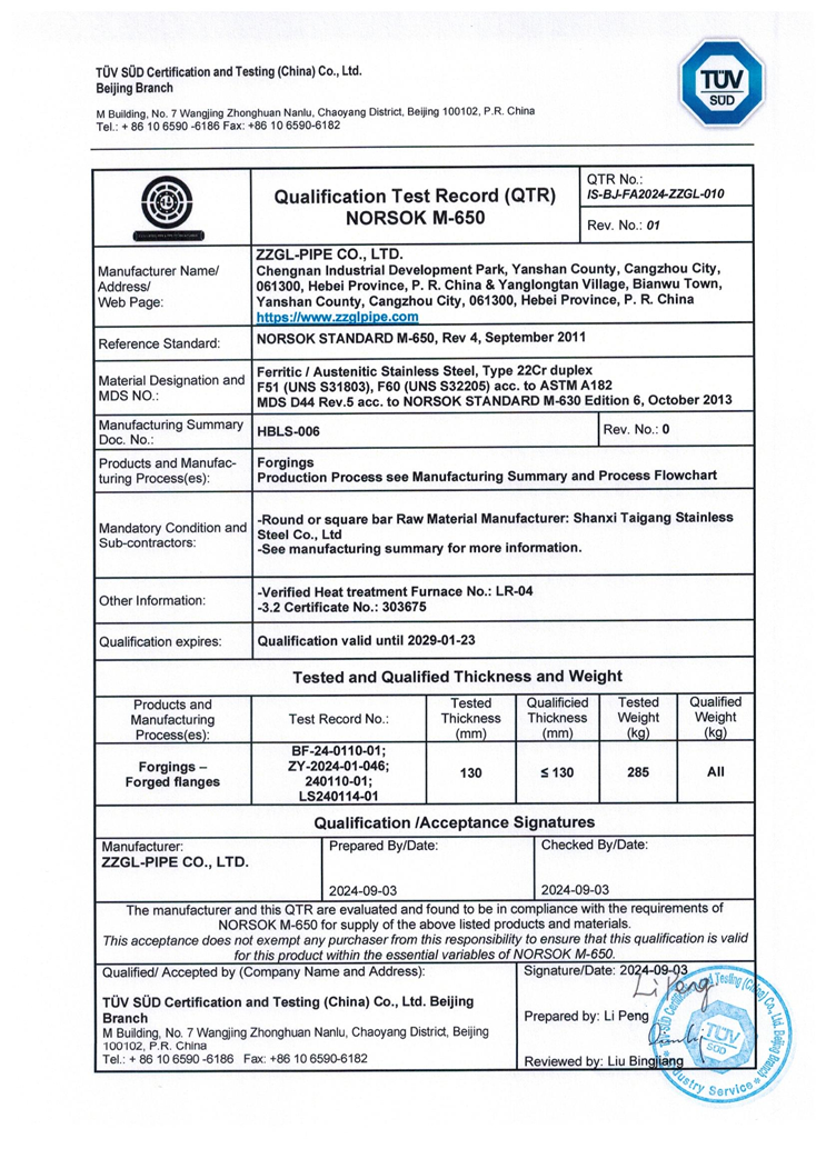 公司已通過挪威國家石油標準NORSOK M-650 ASTM A182 F51(UNS S31803)認證。